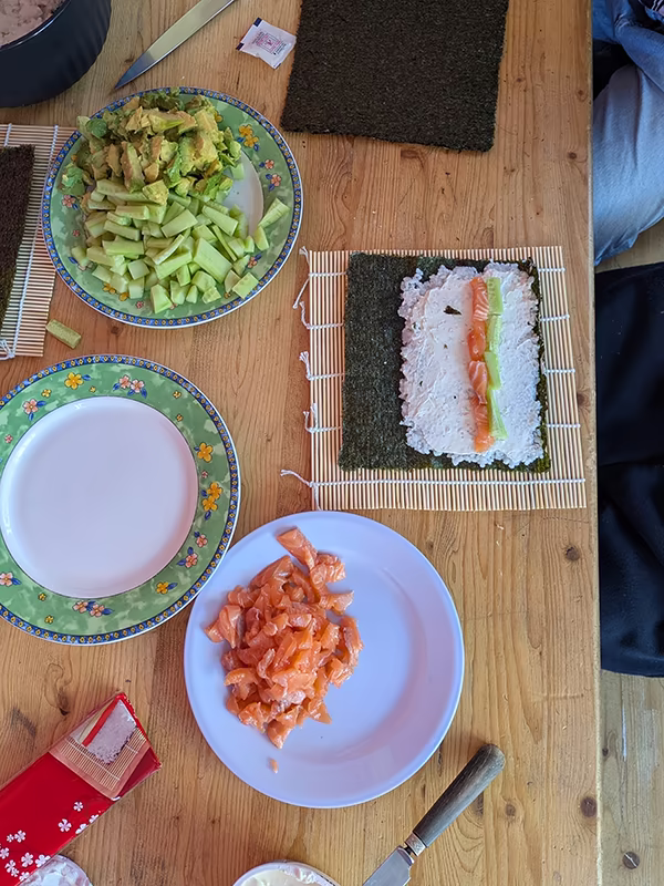 Les élèves ont ensuite eu l’idée d’inviter les parents afin de leur présenter le résultat de leur travail. Certains groupes se sont lancés derrière les fourneaux pour préparer des brigadeiros ou des pão de queijo brésiliens ; d’autres finalisaient leur exposé ou imprimaient leur livre de recettes. Tout était prêt, et nous nous sommes régalés autant des idées que des mets : chips maison, pâte à tartiner sans huile de palme, défi « un mois sans manger de poisson »…