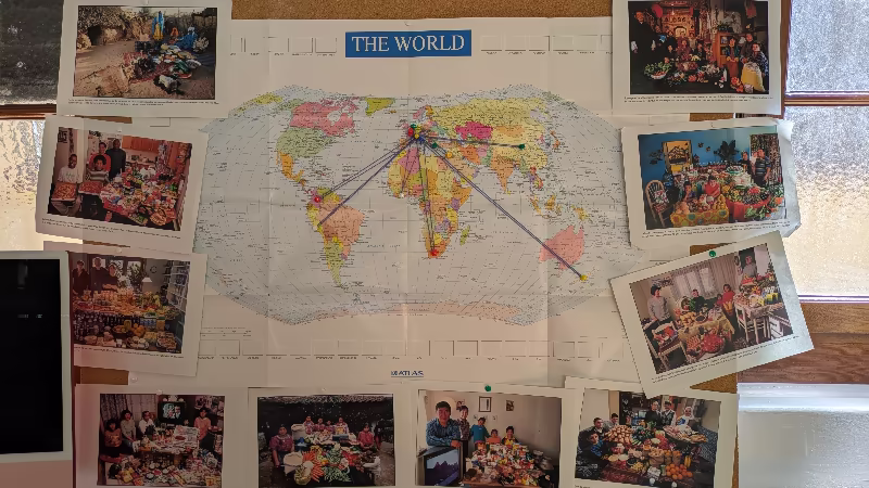 - ce que mangent les familles d’autres pays, grâce aux photographies de Peter Menzel montrant une semaine de nourriture ;
